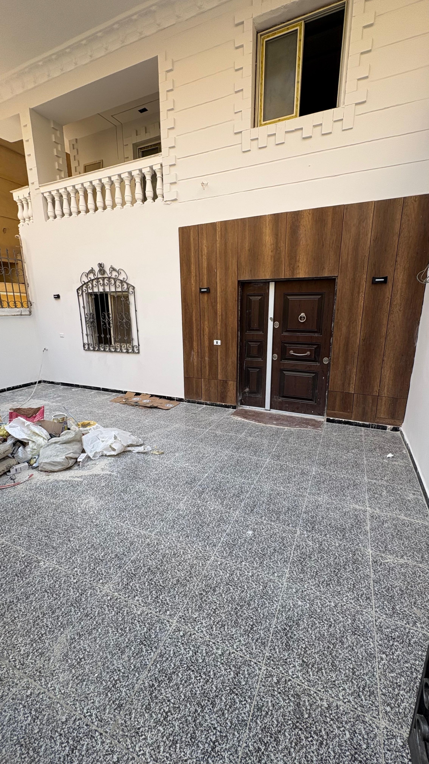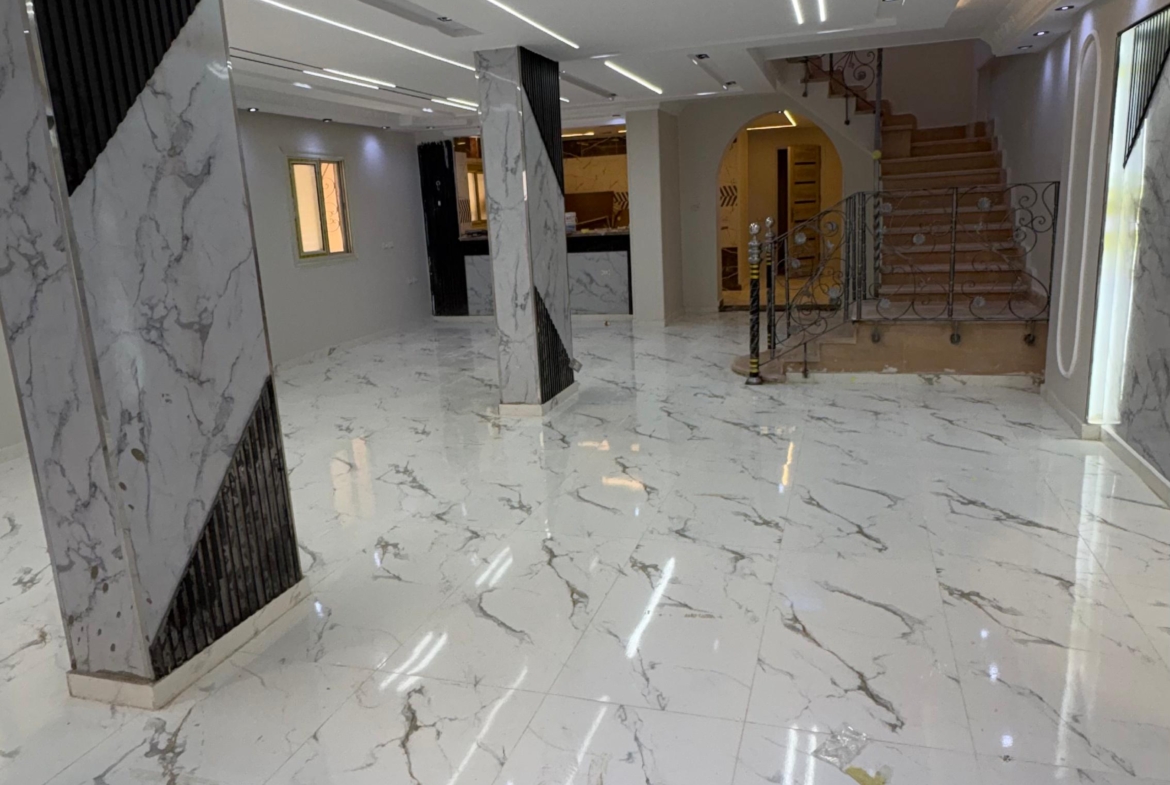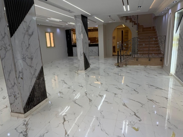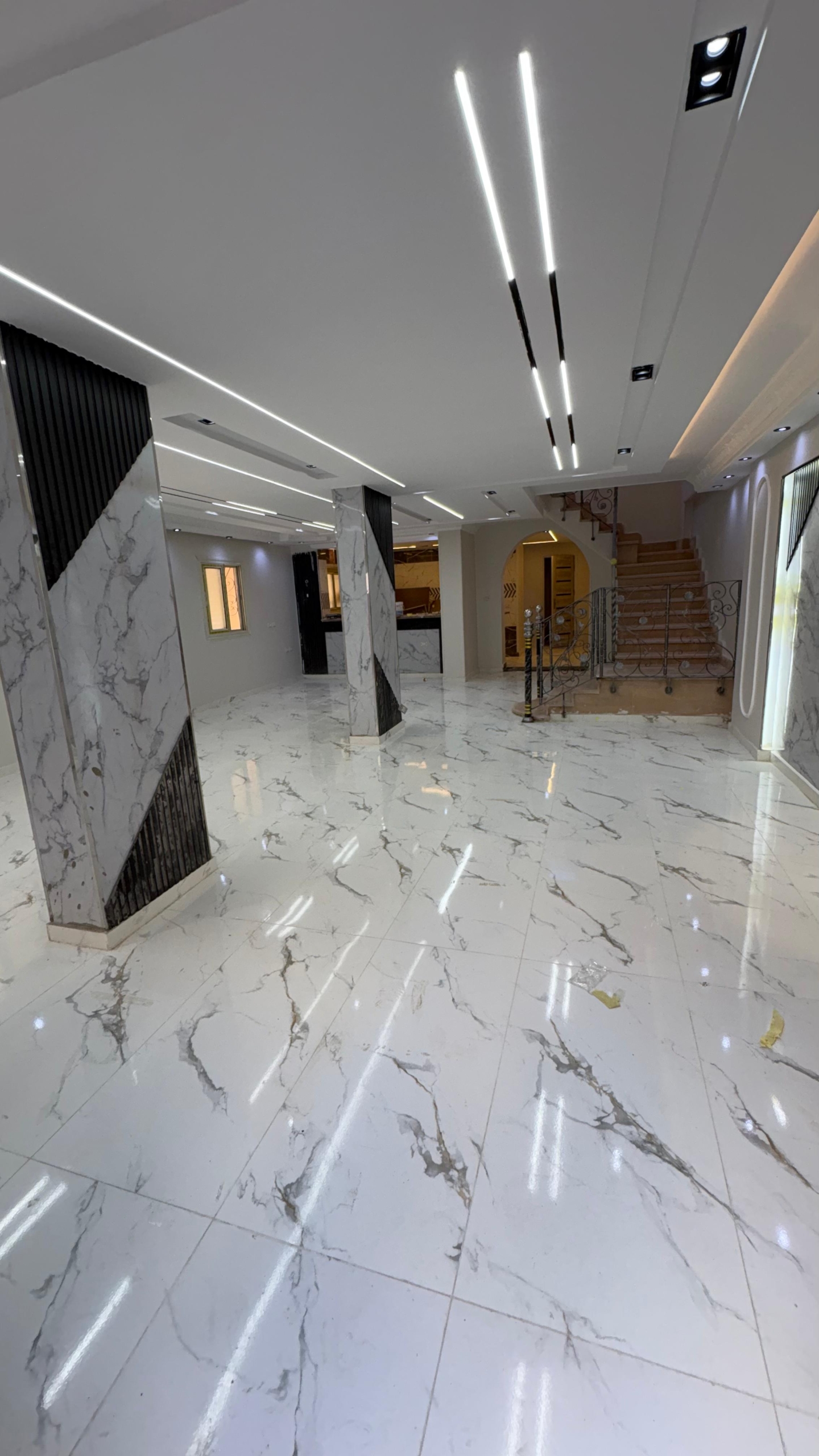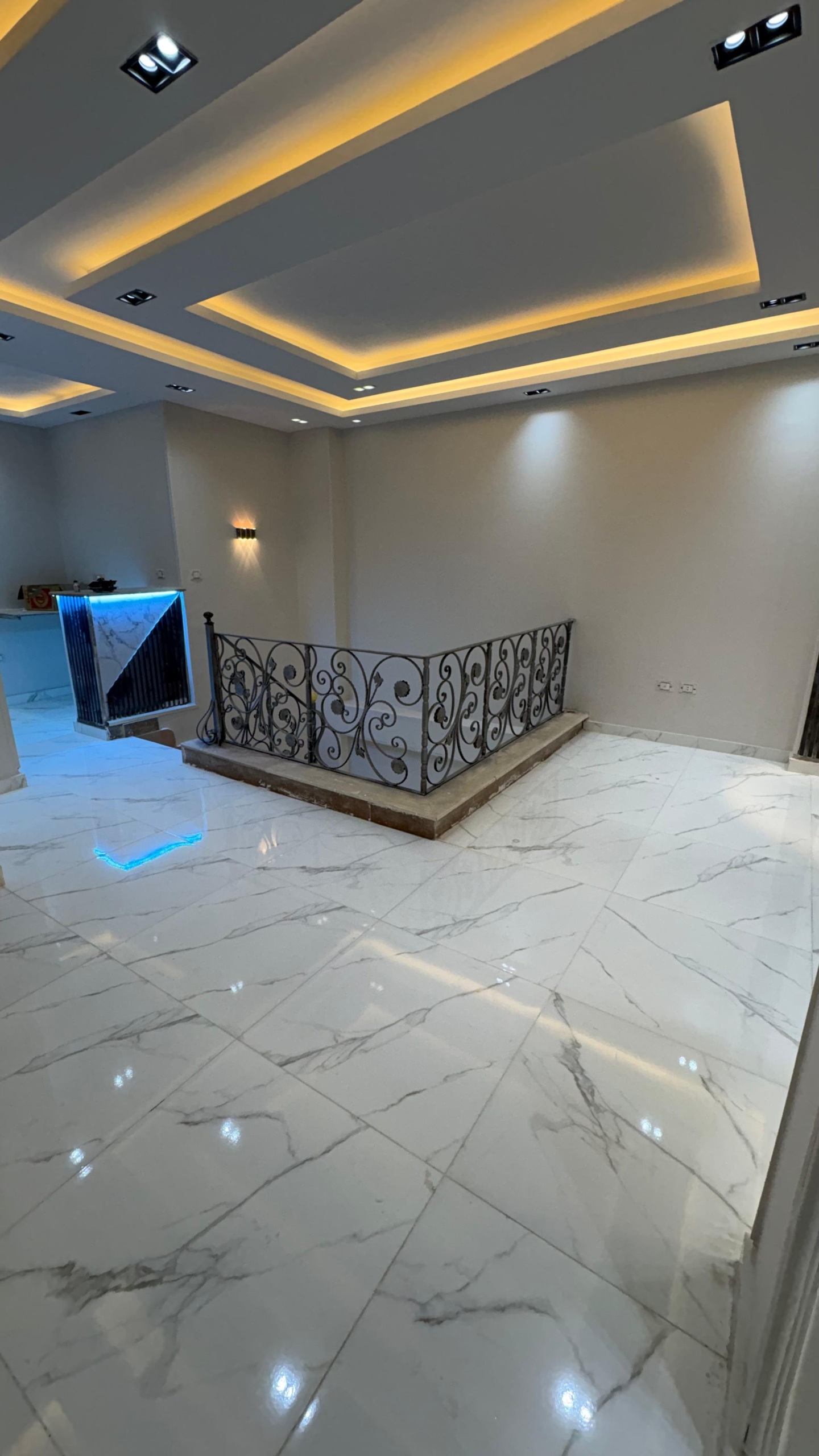 الدور الأرضي: ريسبشن واسع 6 قطع – حمام رئيسي – غرفة تخزين – مطبخ كبير.