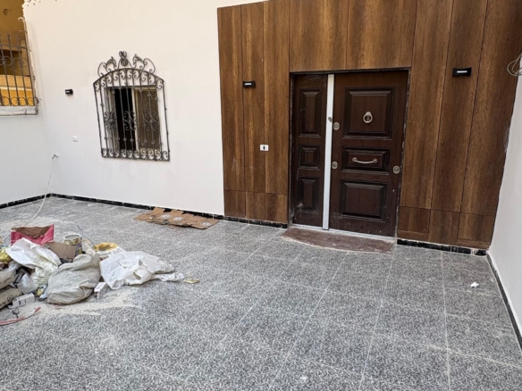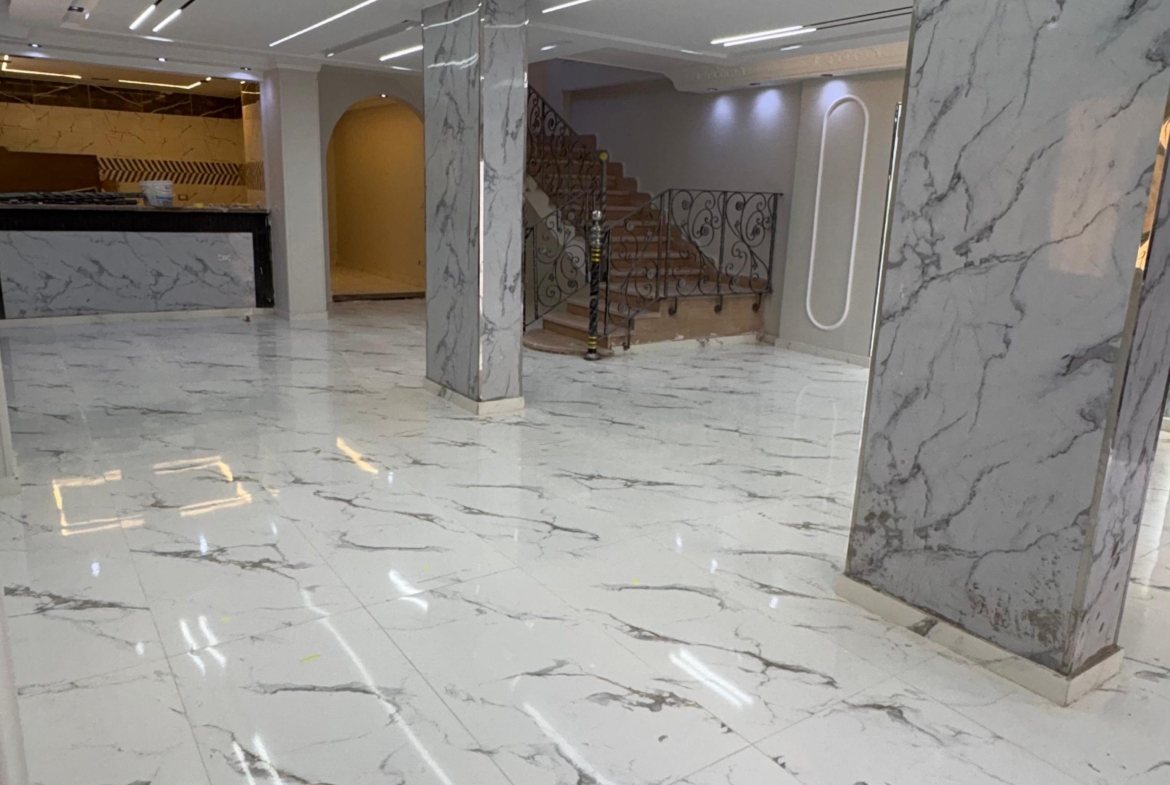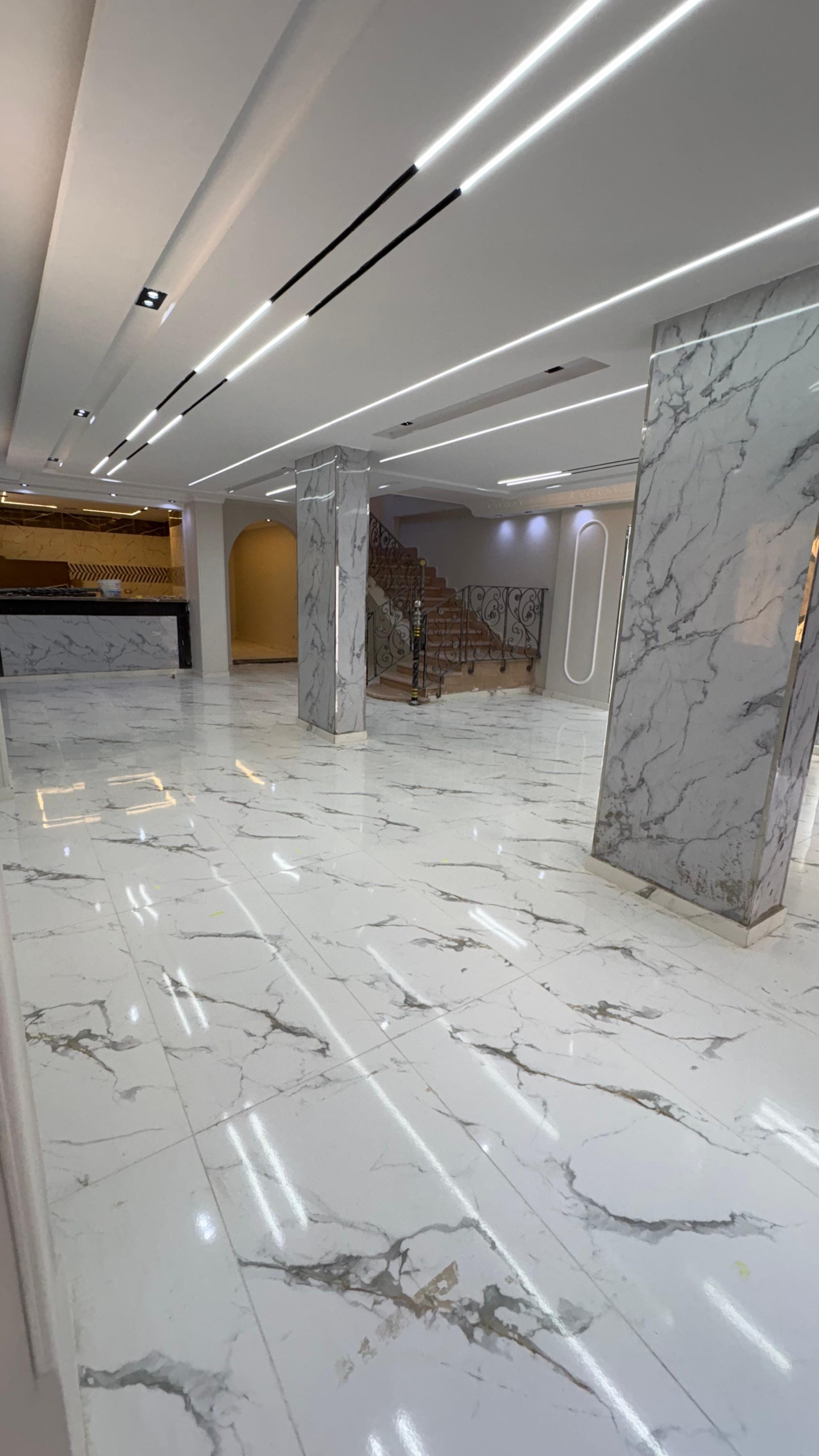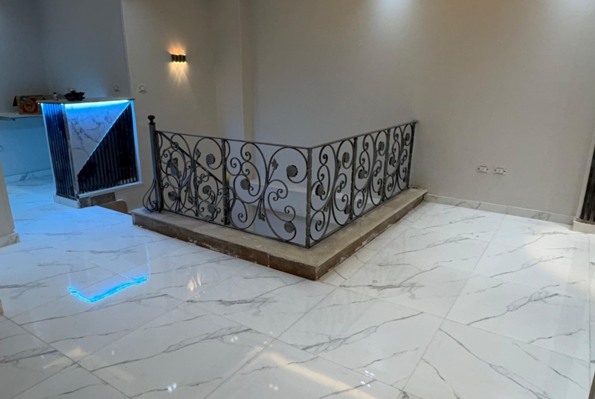 الدور الأرضي: ريسبشن واسع 6 قطع – حمام رئيسي – غرفة تخزين – مطبخ كبير.